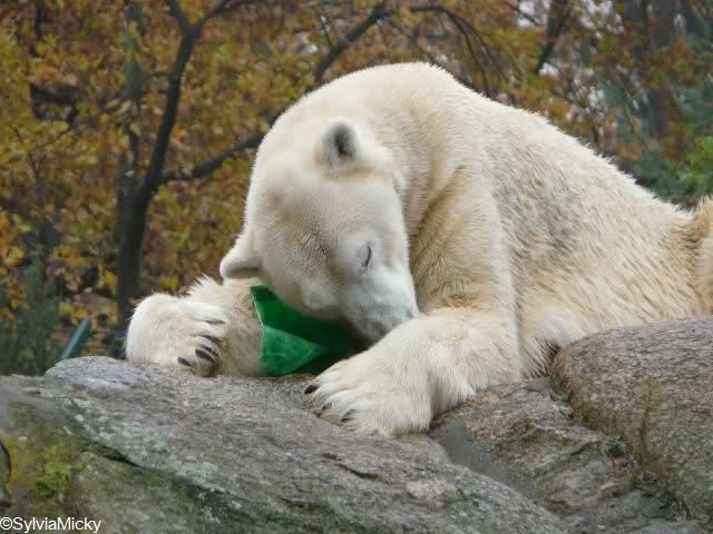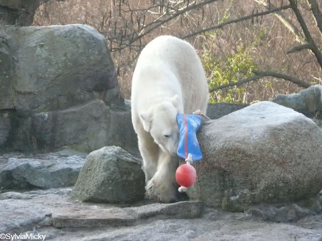 danke für die reizenden Bilder von Nancy. Sicher wollte sie den Ball aus dem Gehege entfernen. Es dauerte nur ein Weilchen. Das Ding war widerspenstig! Schade nur, dass die Qualität nicht gerade zur Eisbärenanlagenreinigung geeignet war. Sie hätten alle mithelfen können. Das ist doch auch natürlich, oder?