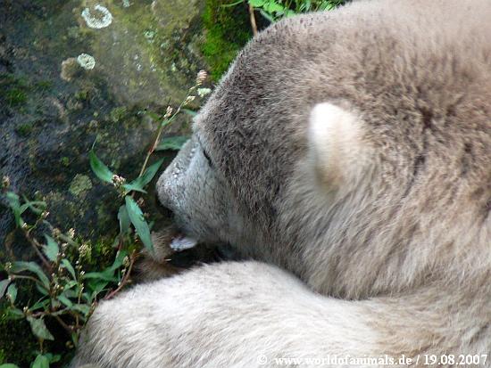Nun mein Bericht von gestern: Wir waren so von ca. 11.45 bis 16.15 Uhr im Zoo. Bei unserer Knutimaus war es noch nicht ganz so überfüllt, da er im Gras gelegen hat und nicht sehr, so würden die Touris sagen, fotogen war. Da habe ich zum ersten Mal gesehen, dass unsere Maus nuckelt, und zwar ziemlich lange und ein bißchen versteckt, aber doch offensichtlich, da er hinterher so viel Schaum am Maul hatte.