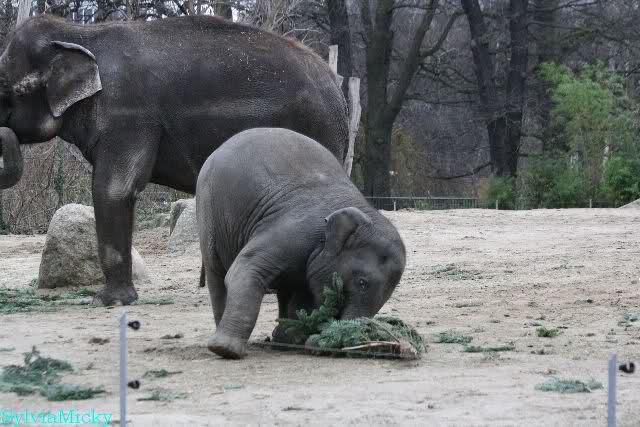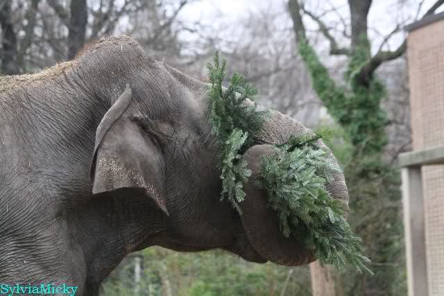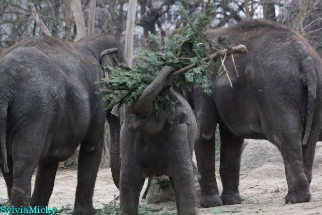 Die Elefanten bekamen heute die Tannenbäume und hatten viel Spaß damit
