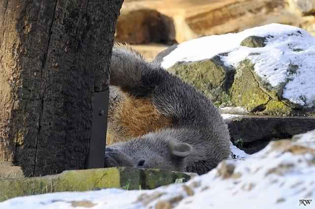 Bei den Malaienbären war heute Ladenschluss. Das heißt, der Schieber war unten und die Malaien drinnen. Eigentlich kein Wunder bei der Kälte; Malaienbären sind Tropenbären und frieren sich bei solchem Wetter allerwerteste Körperteile ab.