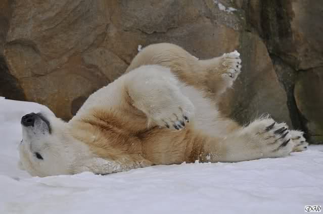 Aber Knut hatte heute anscheinend vom Kraftwerk geträumt. Er bedrängte Gianna stürmisch, warf sie um und zwickte sie in die Seite. Das ließ sie sich natürlich nicht gefallen. Gianna brüllte laut und Knut rannte mit hängenden Ohren davon. Gianna rannte hinterher. Vorn auf der Klippe strichen beide verlegen umeinander herum, beide laut schnaufend und mit Tapirlippe. Es sah aus, als ob sie sich gern vertragen, aber keiner den ersten Schritt machen wollte. Schließlich trennten sie sich. Gianna rollte sich in Knuts Kuhle zusammen. Knut lag unter dem Blechbaum, die Tatzen wie zum Gebet zusammengelegt und betrachtete verstohlen