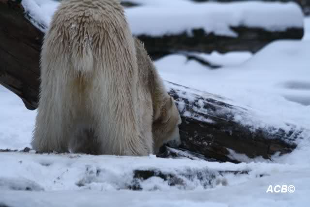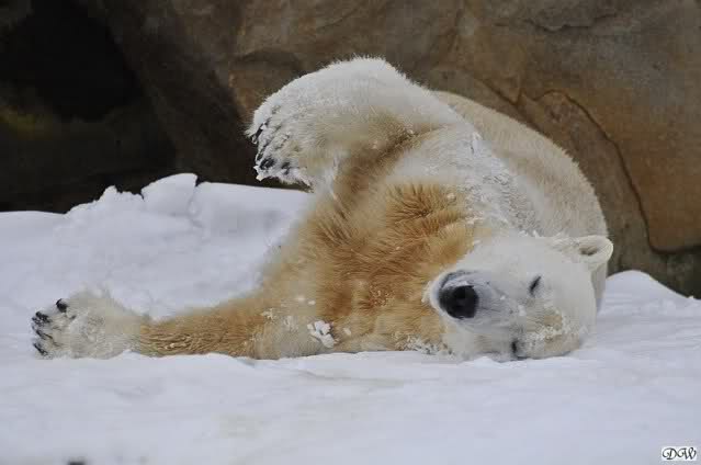 Als ich bei Knut und Gianna eintraf, lagen die beiden in einigem Abstand voneinander im Schnee und dösten. Sie waren völlig ruhig, sicher gefiel ihnen das Eisbärenwetter. Ich sah ihnen eine Weile zu.