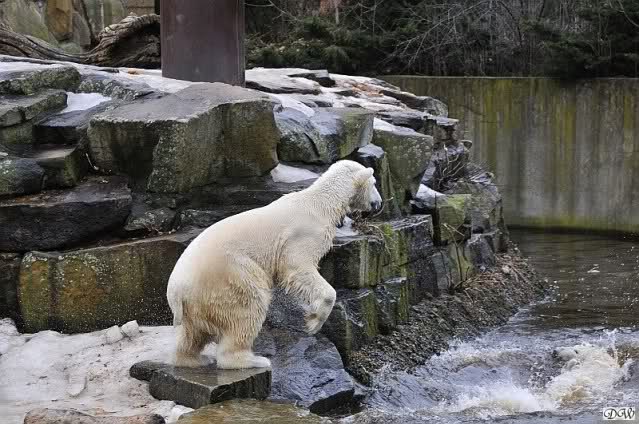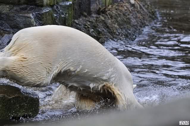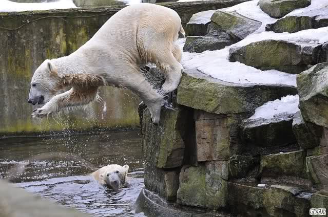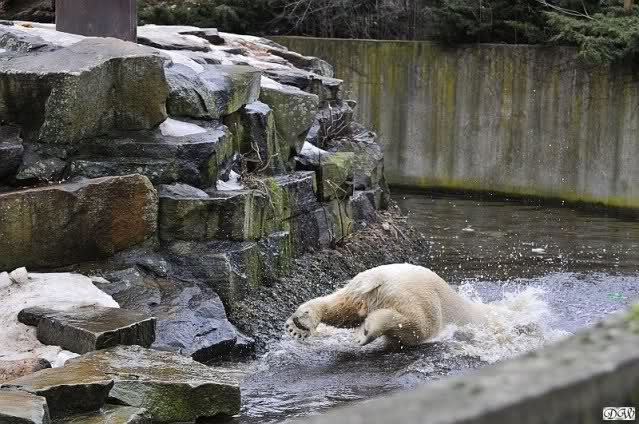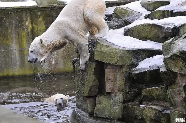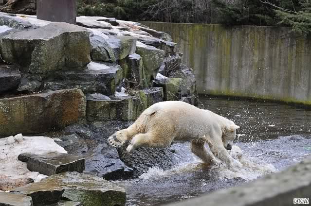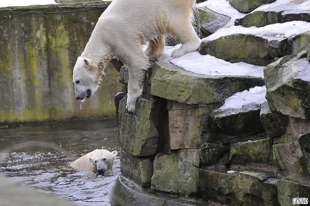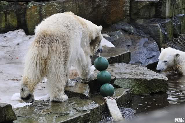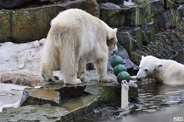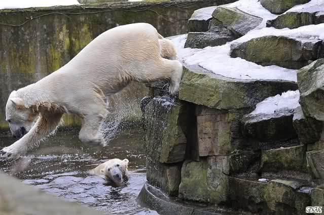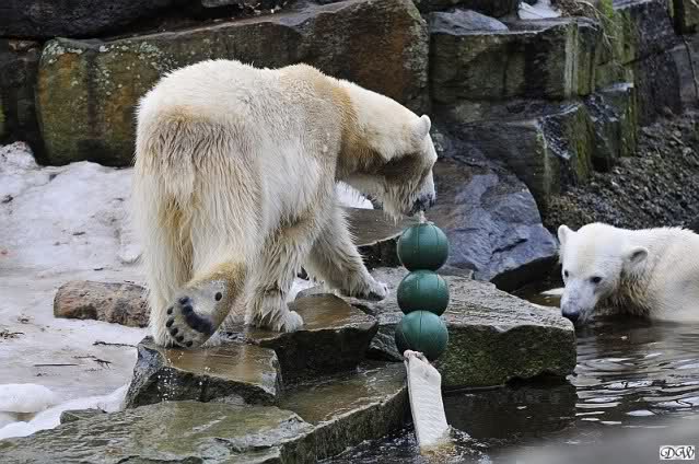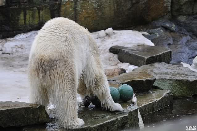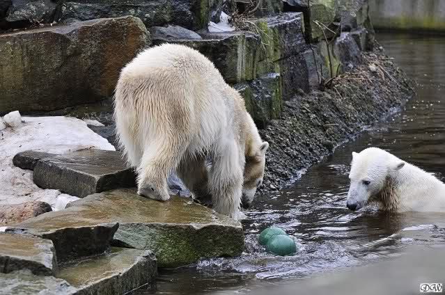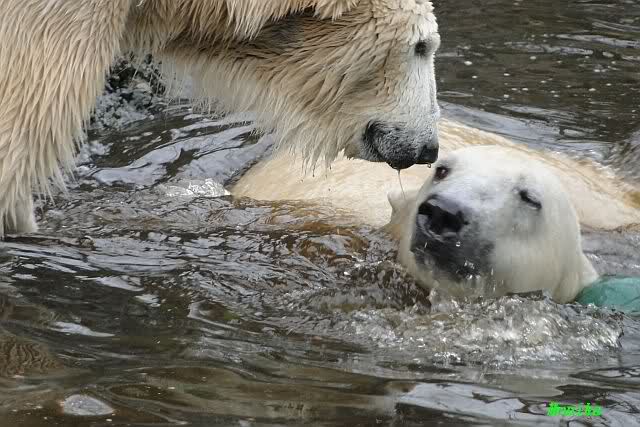 Es war ein aufregender Nachmittag bei Knut und Gianna. Wir erlebten zwei entfesselt spielende Youngster. Sie jagten die Anlage hoch und hinunter, sprangen ins Wasser von allen möglichen Ecken, spielten und tobten miteinander. Die Freude daran war Beiden deutlich anzusehen und die Besucher hatten ebenso viel Spaß sie so zu sehen, wie die Bären selbst. Er holte sich ein Spielzeug, Gianna nahm es ihm weg. Dann holte sie wiederum eins und brachte es ihm als Aufforderung zum Spiel. So ging es über lange Zeit und manchmal wusste man nicht wo man zuerst hinschauen sollte.