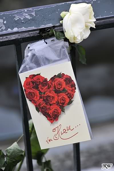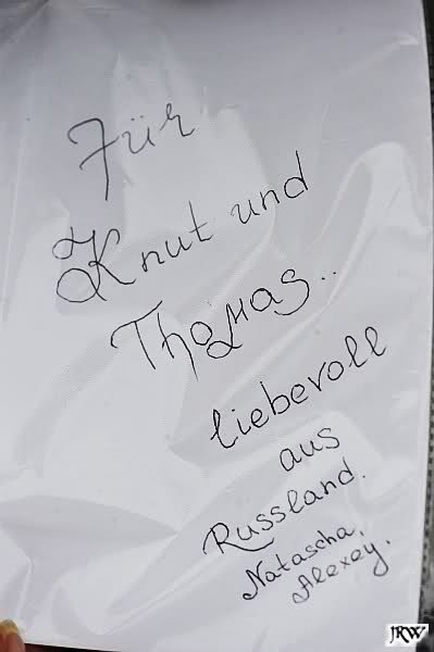 Eine einzelne weiße Rose mit dieser Karte war heute am Zaun bei Knut befestigt. Ein liebevoller Gruß aus Russland