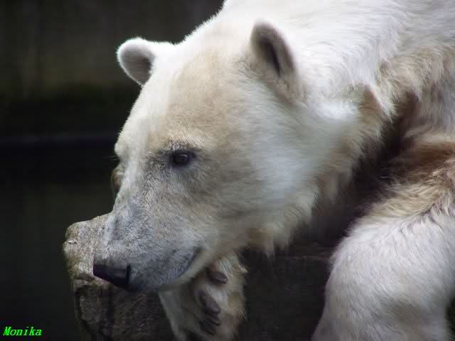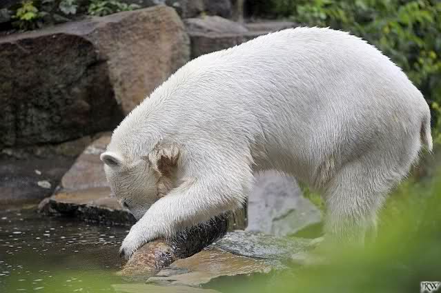 Heute war ein sonniger Tag. Wir erlebten einen weißen Knut. Morgens soll er relativ lange geschlafen haben. Dann spielte er längere Zeit im Wasser mit verschiedenen Dingen, natürlich auch wieder mit seinem geliebten Nackthuhn. Traurig war, dass er heute relativ früh anfing zu laufen. Sein Hunger schien besonders groß zu sein. Ein junger Pfleger fütterte ihn und als es nicht schnell genug ging, kam Knut zu Scheibe, schaute in den Eimer und brummte mit tiefer Stimme. Der Pfleger, der es gut gemeint hatte und Knut Zeit geben wollte, gab ihm seine Leckereien dann etwas rapider und wir sahen dann einen glücklich mampfenden Knut. Bald danach, mit gefülltem Magen entschied er sich ein Schläfchen zu machen. Besuchern passte das nicht und riefen ihn immer wieder. Jedesmal schaute er auf. Irgendetwas erregte seine Aufmerksamt im Innehof und er stellt und setzte sich an die Kante seines Felsen und schaute gebannt dorthin.