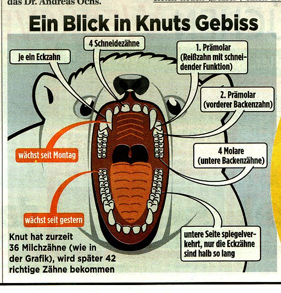 Grund sind Knuts Zähnchen. Wie bei einem kleinen Kind verliert auch er irgendwann seine Milchzähne. Jetzt stößt ein Eckzahn durch und der ist bei Eisbären besonders stark. Und daher ist dies ziemlich schmerzhaft für Knut. Er hat inzwischen Antibiotikum bekommen und sollte er morgen fit sein, wird er natürlich wieder seine Knut-Show abziehen können.