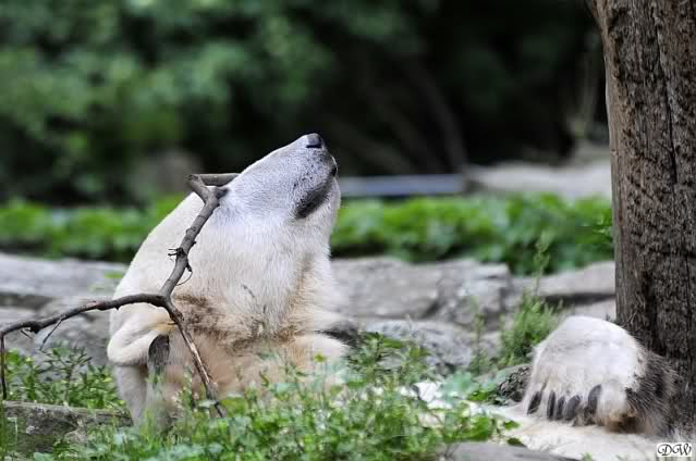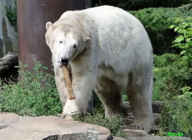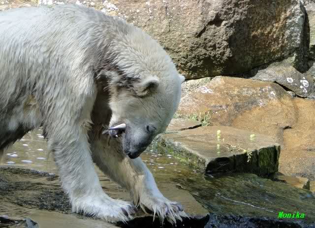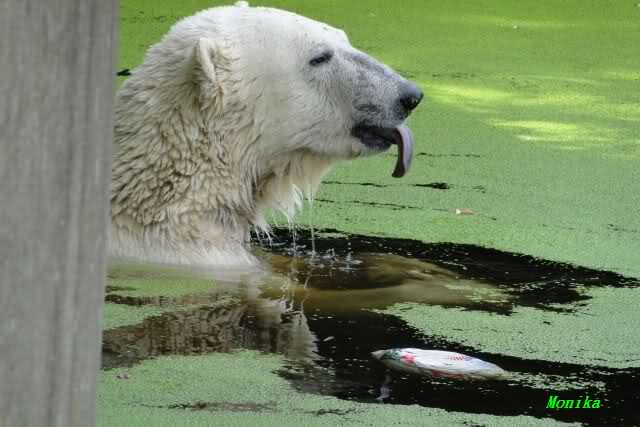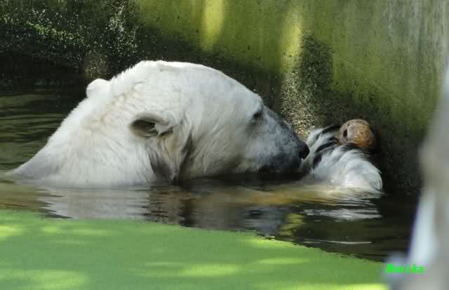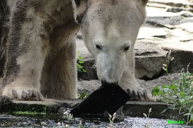 ich hoffe auch auf ganze Haufen von Sachen zur Beschäftigung auf der kleinen Anlage. Seit ich einmal Nancy unverhofft fast Auge in Auge gegenüberstand, weiss ich wie klein diese Anlage plötzlich aussieht, wenn darin eine grosse Eisbärin steht. Da wäre es mir doch lieber, dass die grossen Eisbärinnen, wenn sie eine nach der anderen zu Knut auf die kleine Anlage gelassen werden, etwas Anderes schmackhafter finden als Knut. Es würde mich sehr beruhigen, wenn ein guter Vorrat Lachse bereitliegen würde und ein paar C-Schläuche mit anhängendem Feuerwehrwagen wie in Nürnberg.