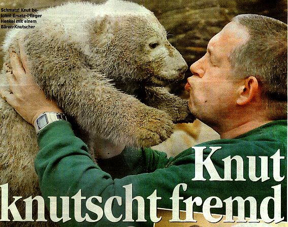 Nanu, Knut *knutscht* fremd ? Kaum ist sein Ziehvater zwei Tage weg, schon freundet er sich mit seinem *Onkel* an. Der kleine Eisbär reagiert wie ein Menschenkind. Wenn Knut sein Futter bekommt und lieb behandelt wird, dann gewöhnt er sich täglich besser an seine Ersatzeltern, so der Zoo-Biologe Dr. Ragnar Kühne.