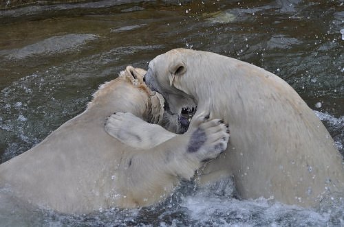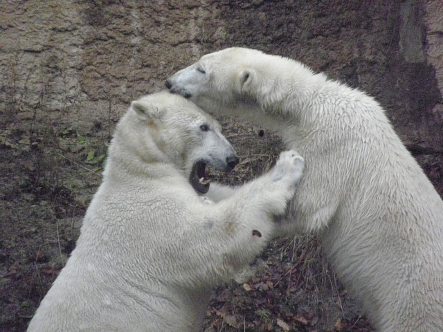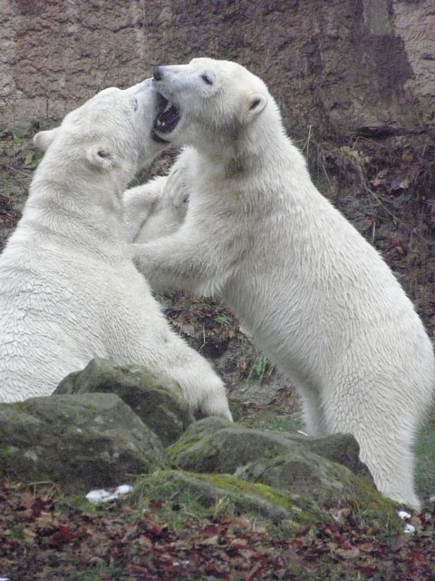 Dann bin ich zu den Bärchen. Erstmal war nicht viel los bei den beiden. Sie haben sich immer wieder in den Stall verdrückt und Flocke schien nicht wirklich Lust auf Raspi zu haben. Der hat sich dann zwischendrin mal zum Dösen hingelegt, bevor beide wieder im Stall verschwanden. Ich beschloss trotzdem, noch etwas auszuharren und das hat sich dann durchaus gelohnt Plötzlich kamen beide raus und es wurde erstmal gerauft, leider teilweise hinter den Steinen, so dass ich nicht alles mitbekommen habe. Flocke war dann öfter am Laufen und Nuckeln oder die kleine Insel abschnuppern, während Raspi mal wieder Show im Wasser gemacht hat. Reifen, Vogelreste, Flockes Kanister, egal was, Hauptsache er kann was rumschleppen und traktieren Nach fast 3 Stunden hatte ich dann leider eisige Hände und Füße, so dass ich doch lieber gegangen bin, auch wenn ich Raspi noch stundenlang hätte zuschauen können.