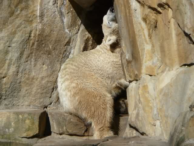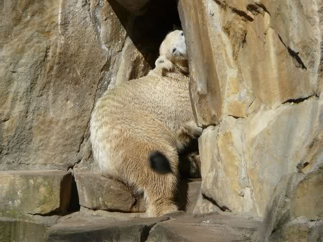 Heute Vormittag versuchte Knut in seine Höhle zu kommen. Ich weiß nicht, ob er darin was gehört hat. Danach lag er lange im Sonnenkringel und schlief.