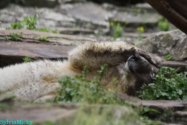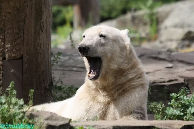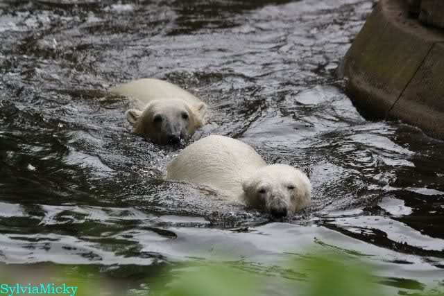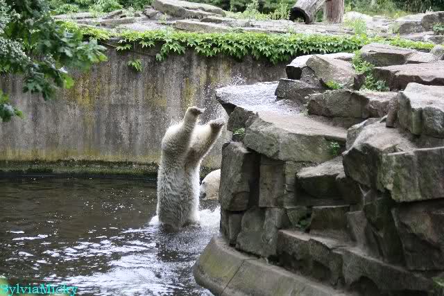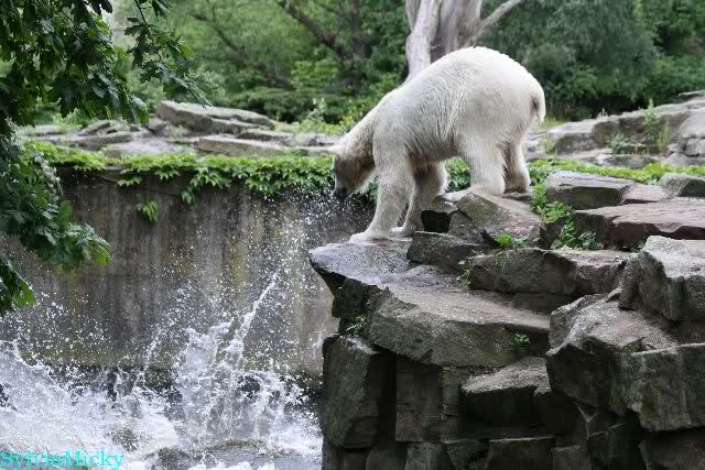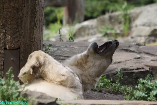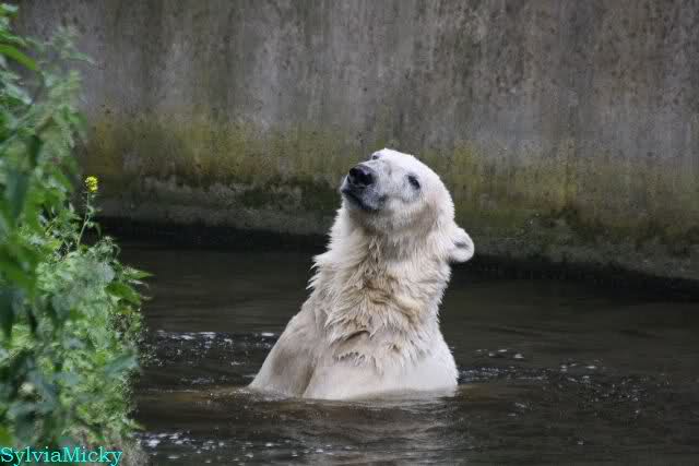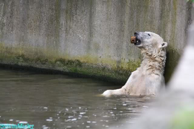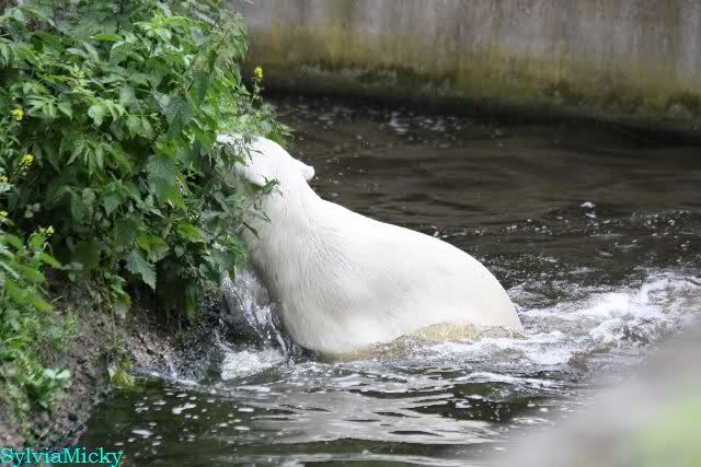 Den Vormittag kann man so beschreiben. Knut schlief und Gianna lief über die Anlage. Zum Teil sehr hektisch. Sie schaute oft zu den Kragenbären rüber. Vermessungstechniker waren nicht zu sehen. Als Knut langsam erwachte wurde erstmal gestreckt und gereckt. Langsam wie es so seine Art ist, ging er zum Wassergraben und schwamm einige Runden. Er fand dann ein Stück Holz, mit dem er sich lange und ausdauernd beschäftigte.