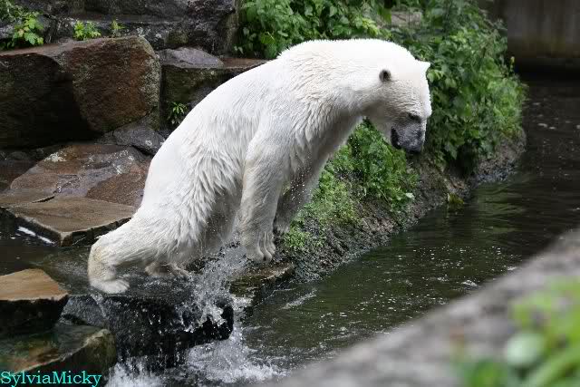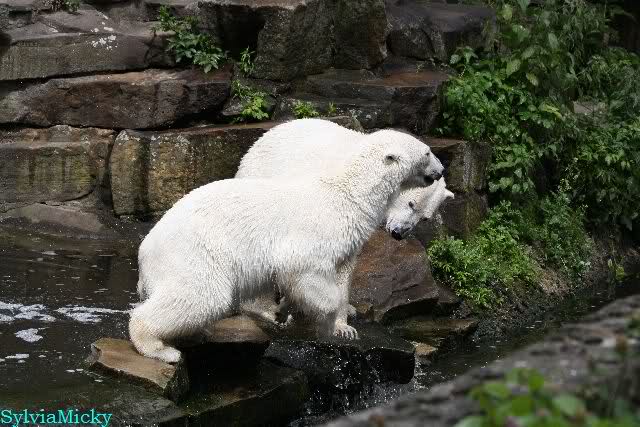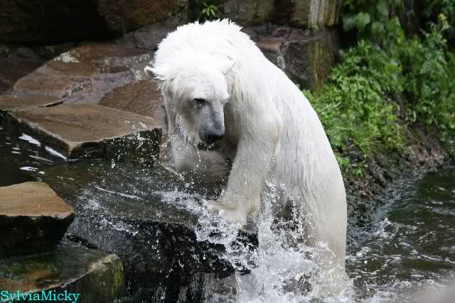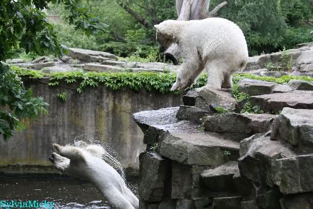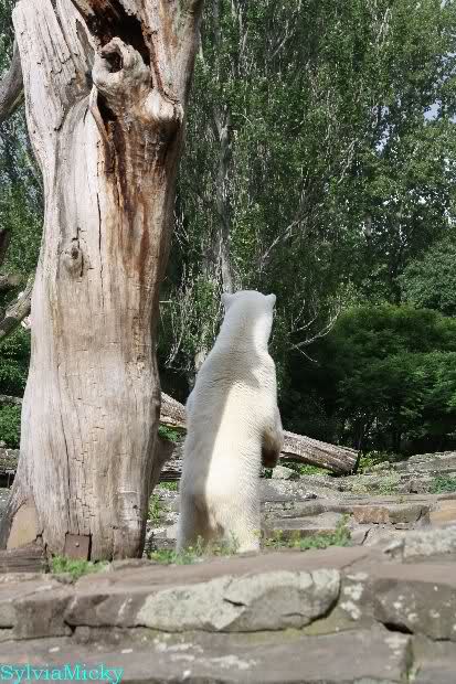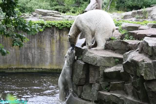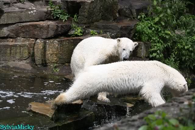 Welch Kräfte messen für Knut und Gianna. Schließlich hat ja Knut ein 280 Kilo (von mir geschätzt) Gegenüber, der er sich sehr gut erwehren kann. Welche Kraft, Ausdauer und Kondition er beim toben an den Tag legt ist schon beeindruckend. Irgendwann war es Gianna zu viel und sie lief auf der rechten Seite des Felsens auf die Anlage.