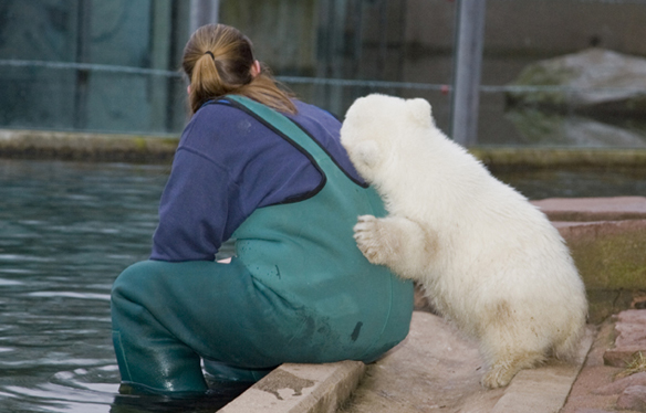 Flocke ist heute vor vier Monaten auf die Welt gekommen. Aus Gründen der Sicherheit für das Eisbär-Baby beschloss der Tiergarten, es von Tierpflegern per Hand aufziehen zu lassen. Es hat sich eine gelungene Beziehung zwischen Flocke und ihren Pflegerinnen und Pflegern entwickelt. Flocke schmiegt sich hier innig an Stefanie Krüger, die Jüngste unter den Pflegeeltern. (Foto: Ralf Schedlbauer)