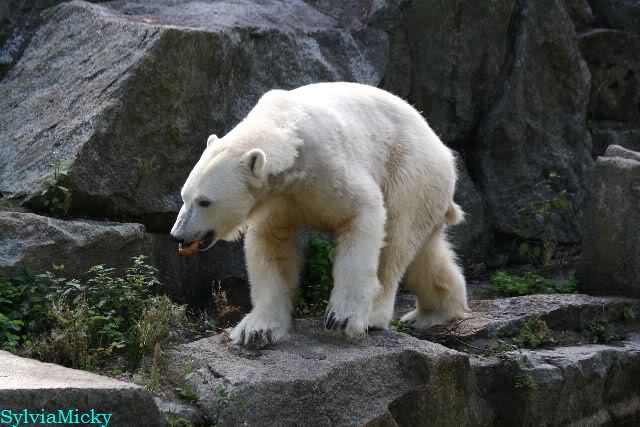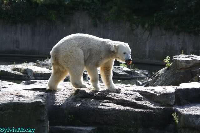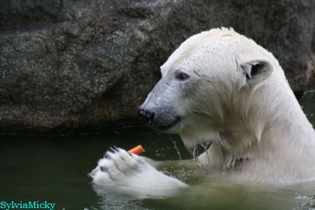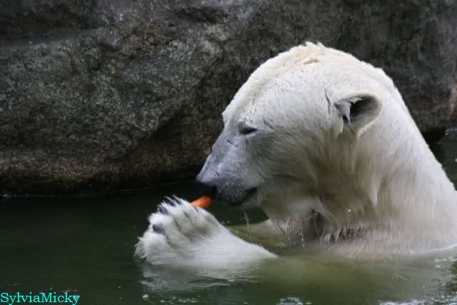 Dear Ursula, I have seen your comment about the food delivered at Zoo Berlin. And I cannot agree with your statement. As you know, Gudrun is regularly making a Bear Delivery as well as many others do. So far, I never heard somebody complaining about unfriendly reactions. During my last visit, when Patrizia from Italy was there too, she handed over a lot of goodies for Knut to Ms. Weckert and these gifts were kindly and friendly accepted. And even given to Knut the very same day. And when Ms. Weckert was giving the grapes, the fishes, the baguette and the pumpkin to Knut, she took her time so that pics could be made of that (and I made them because it was such a nice souvenir, and I am sure that sooner or later Knuti will have her ball too). By the way, if I have a question, I have to ask it in English and so far, I always got a reply (and as you know, I do not care that it is in German).