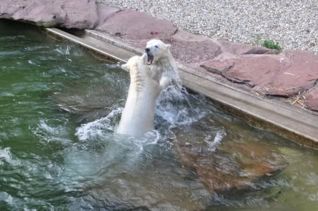 Einfach herrlich anzusehen: Flocke und Rasputin balgen sich im Wasser. Happy polar bear kids. Danke Uli für die weitere Bilderserie von den beiden glücklichen Eisbären Kids.