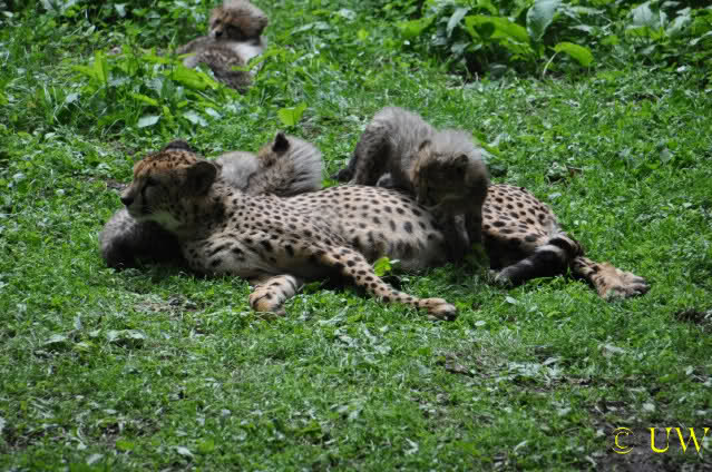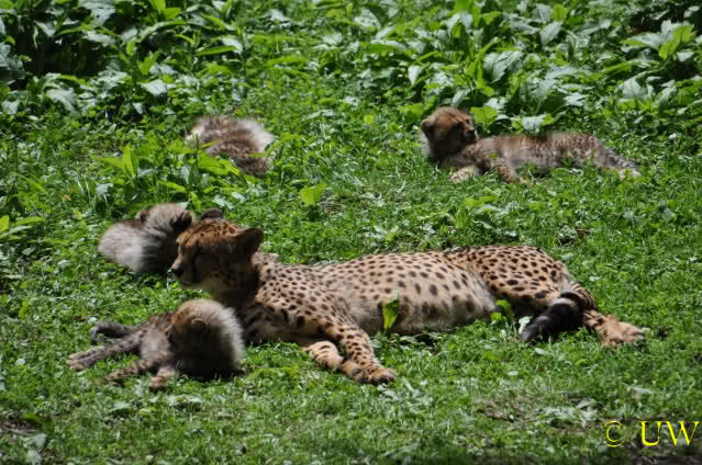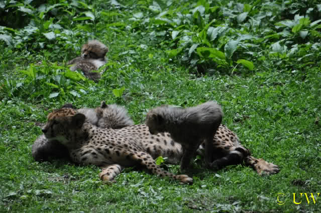 Es sind übrigens 4 kleine Geparden, allerdings bekommt man sie kaum einmal alle zusammen aufs Bild, weil sie ihre Anlage erkunden. Mal sehen, wie groß sie in den letzten beiden Wochen geworden sind
