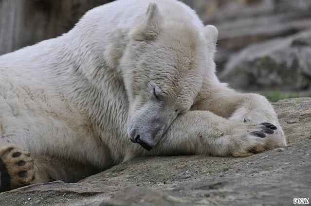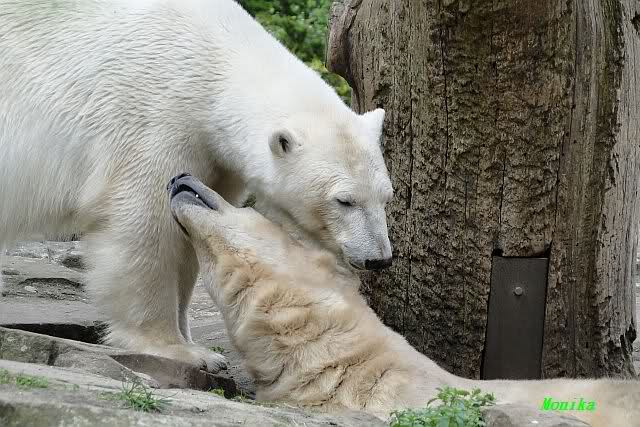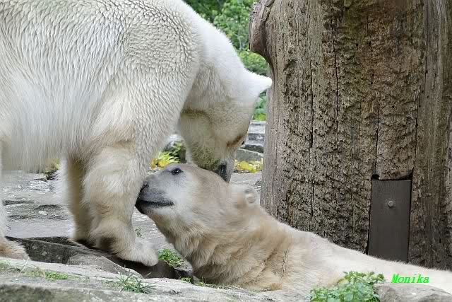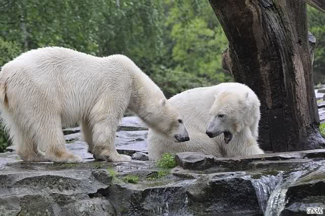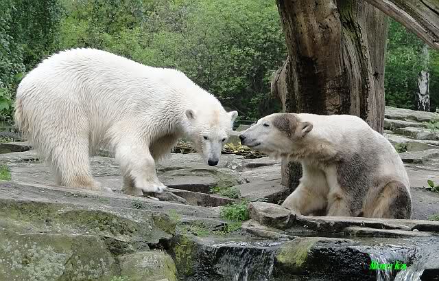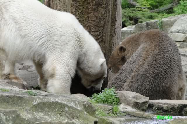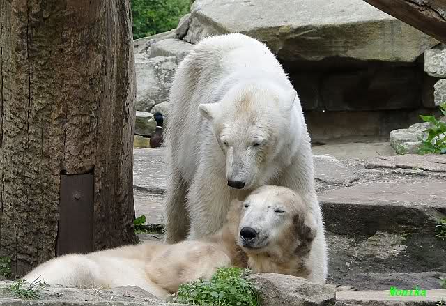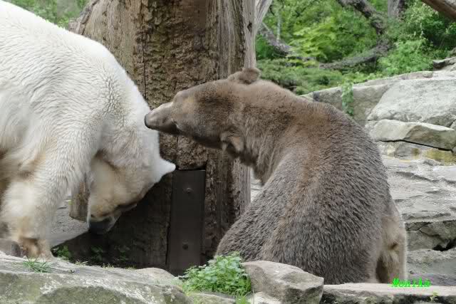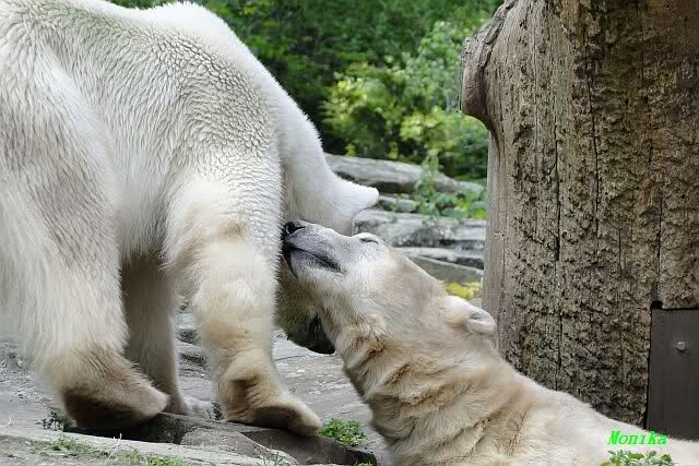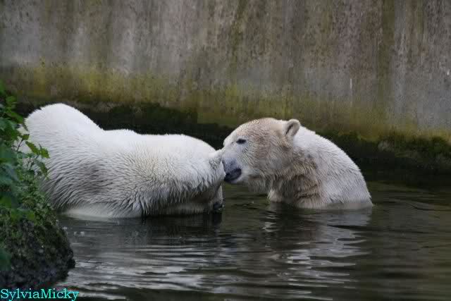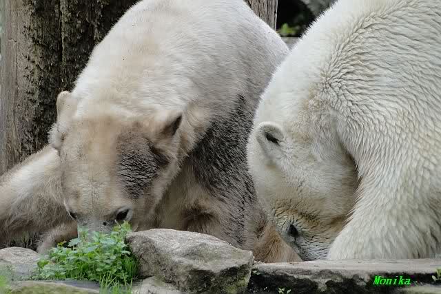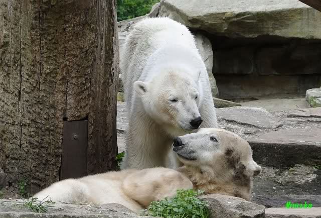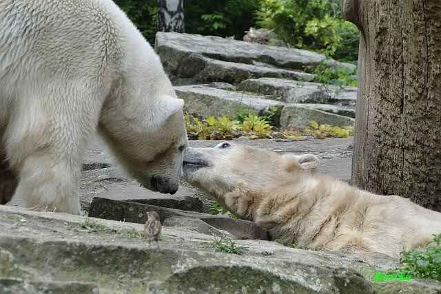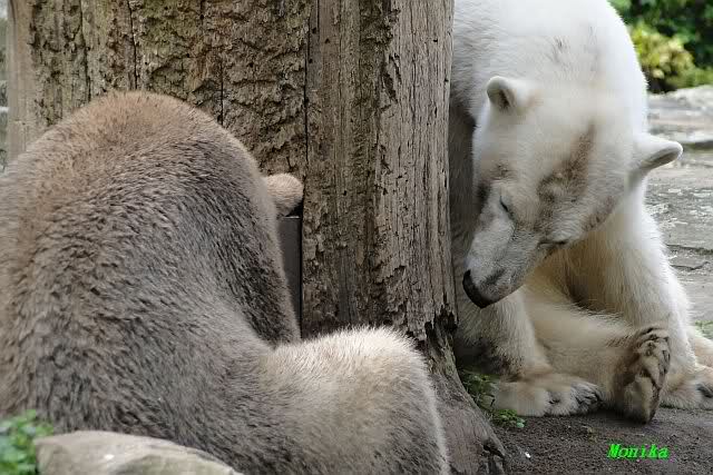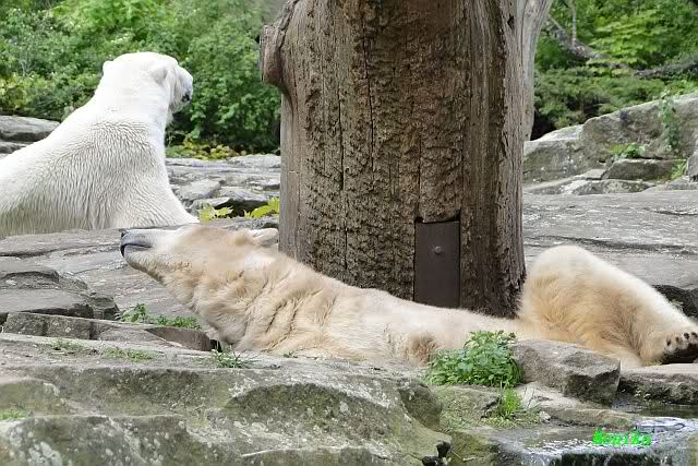 Heute Vormittag schlief Knut und Gianna lief. Sie ging mehrmals sehr vorsichtig zu ihm hin aber Knut zeigte Tapirlippe oder zog sich zurück. Merkwürdig dies Verhalten in letzter Zeit. Nur im Wasser zeigt er keine Ängstlichkeit.