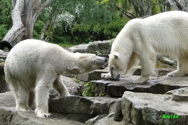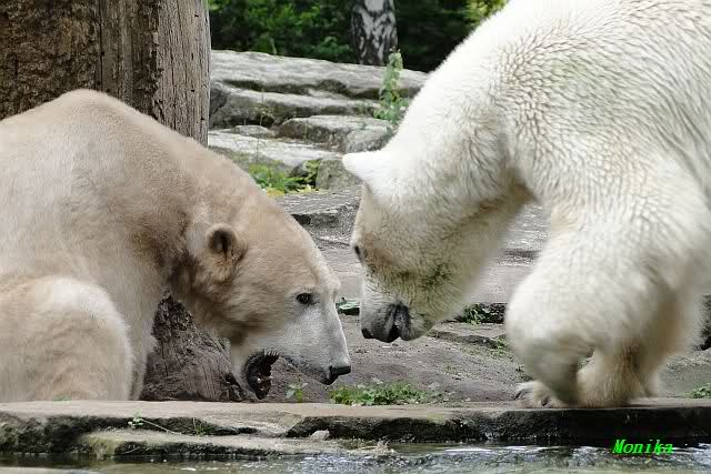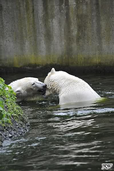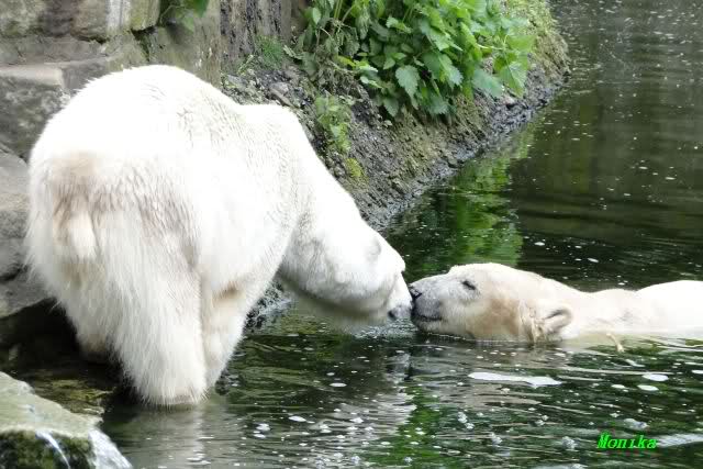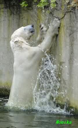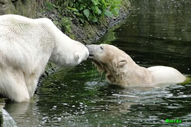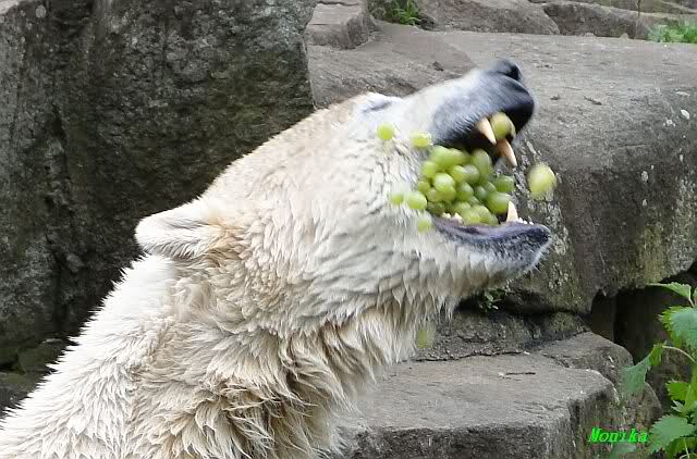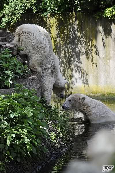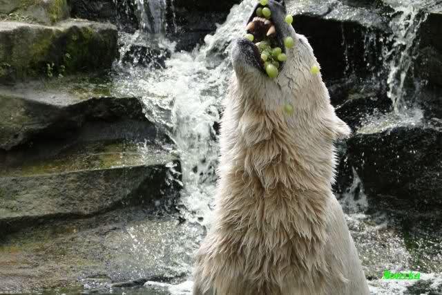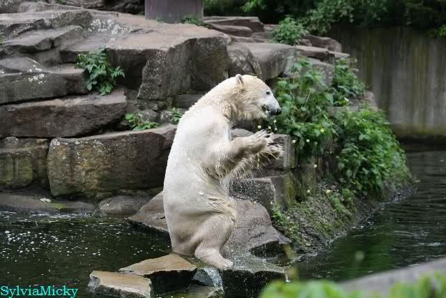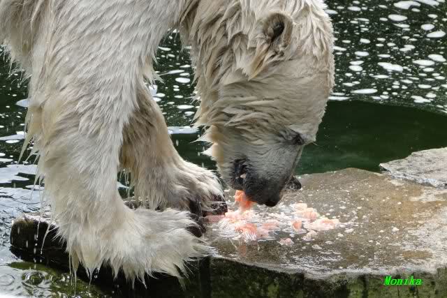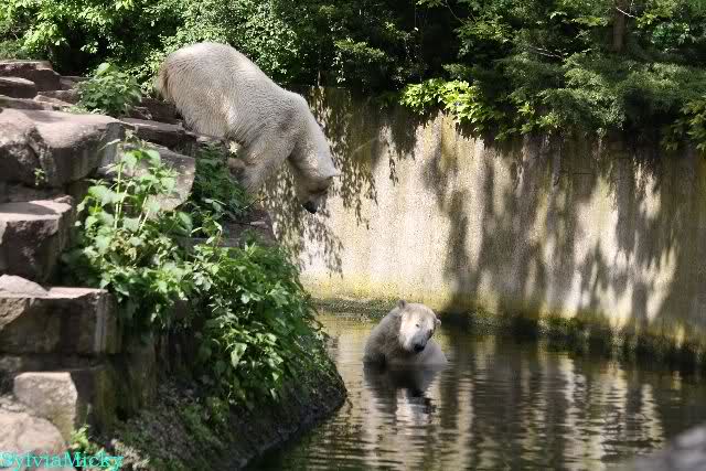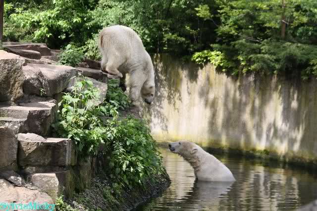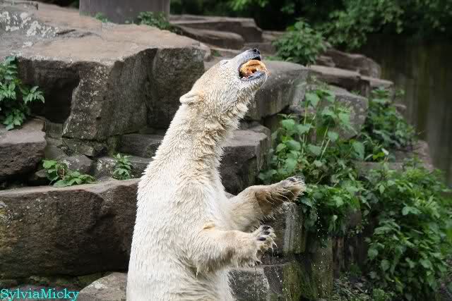 Als eine Kindergruppe wieder Brötchen und Nüsse bei den großen Eisbären verteilte, weigerte sich Nancy standhaft ins Wasser zu gehen. Tosca und Katjuscha ließen es sich hingegen schmecken.