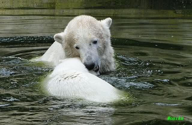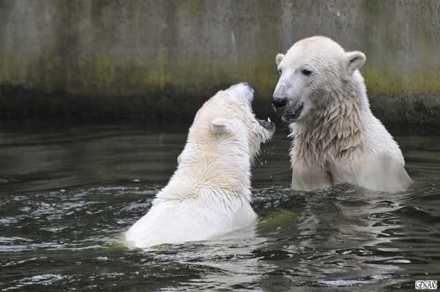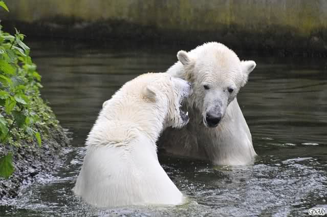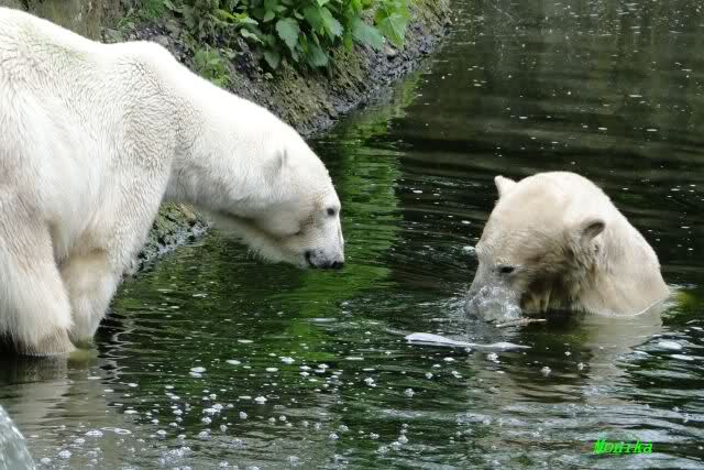 Nach der Fütterung spielten die beiden eine kurze Zeit im Wasser. Knut fand das Huhn. Er hoffte, daß sie ins Wasser kommen sollte aber Gianna wollte aber nicht.