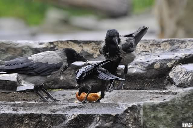 Die Krähe räumte das Spatzennest aus. Unter dem Baum schlief Knut.