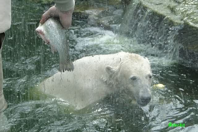 Heute war der nette Knutfreund mit dem Mittwoch-Montagslachs im Zoo. Er las im Internet, daß Gianna Knut einen Lachs weggefressen hat, also brachte er heute einen Ersatzlachs. Sehr nett von ihm.
