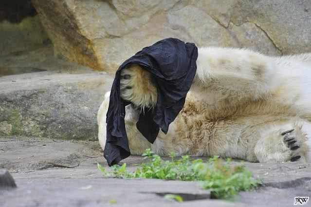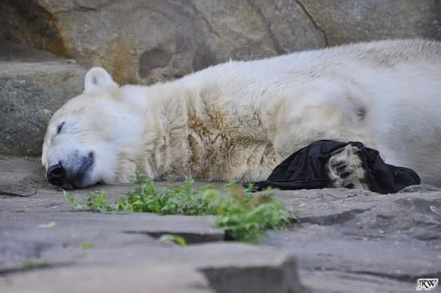 Nach der Abendfütterung kam Knut wieder heraus. Was brachte er mit? Natürlich sein geliebtes T-Shirt. Eine Weile spielte er damit, schlief ein nur um wieder aufzuwachen und erneut ein wenig zu spielen. Letztendlich übermannte ihn dann doch die Müdigkeit, er machte es sich mit Shirt gemütlich und schlief ein. Er sah einfach wundervoll aus. Seht selbst.