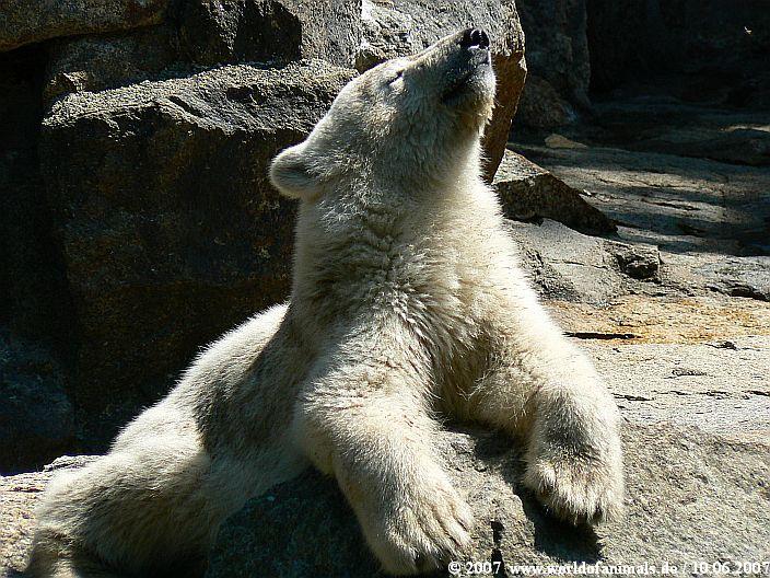 Am besten fand ich, als ich von Hartmuth erfuhr, dass Knut im kleinen Eisbärengehege zwischen den Vorstellungen zu sehen ist. Schon gleich zu Beginn waren wir ganz alleine dort, bis ein paar Menschen hinzukamen und ihn fotografierten. Aber Knut lag ziemlich apathisch auf einem kleinen Felsen, es schien als wäre er traurig.