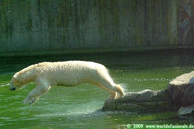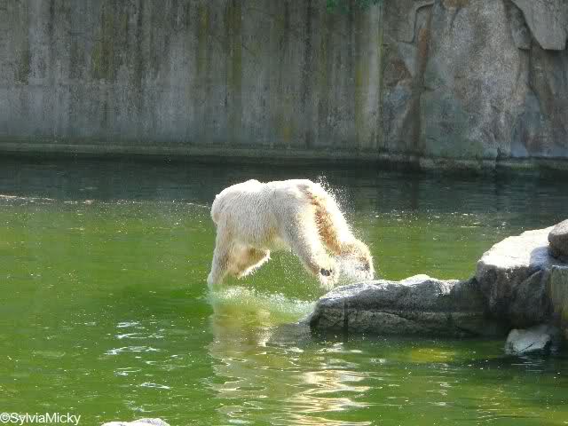 Hier nun Fotos vom heutigen Nachmittag. Die Sprungfotos entstanden zu einer ganz anderen Zeit als die von SylviaMicky. Das zeigt auch, wie lebhaft es heute auf der Eisbärenanlage zuging.