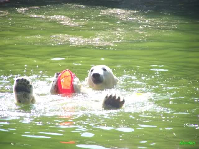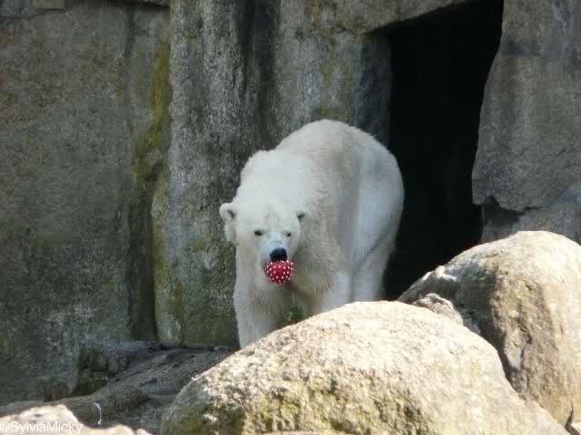 Gestern standen zwei jüngere Frauen neben mir am Gehege und sagten: Knut spielt viel besser als die Großen. Ich sagte: mit was sollen sie denn spielen, sie haben doch nichts.
