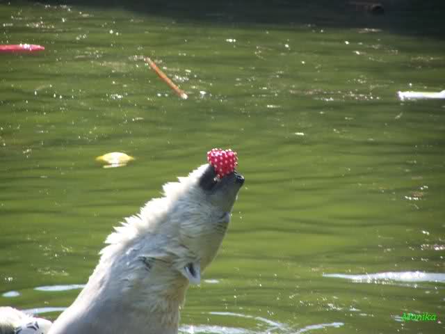 Sieht man sonst nicht viele Besucher bei den großen Eisbären (außer bei der Fütterung), drängten sich heute die Besucher an der Anlage, denn die vier Bären boten einen ungewöhnlichen Anblick: Sie tobten ausgelassen im Wasser herum, jagten sich gegenseitig über die Anlage und beschäftigten sich mit dem vielen Spielzeug.