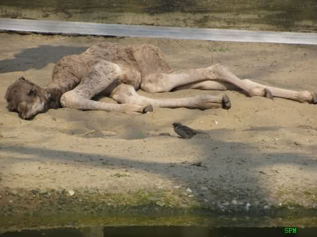 Das kleine Dromedarmädchen ist von der Frühlingssonne geschafft.