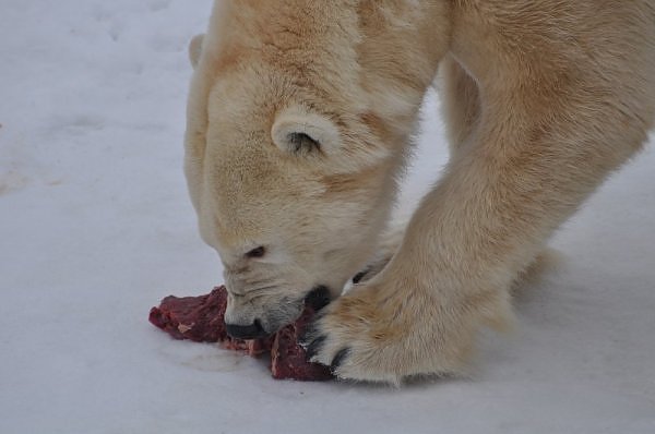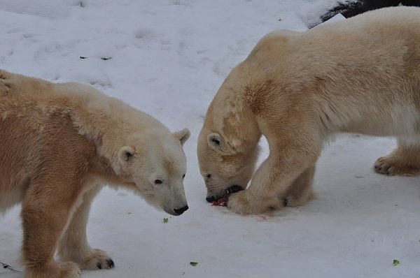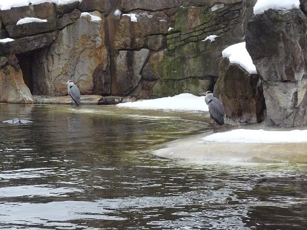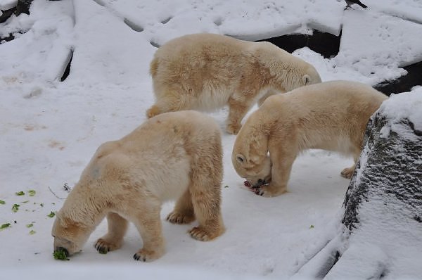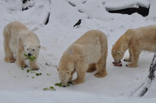 Die Vögel im Zoo werden gut gefüttert. Viele Besucher bringen etwas mit. Nicht nur am Gehege von Knut wird Futter verteilt und Meisenknödel, Meisenringe und Erdnußsäckchen angehangen.
