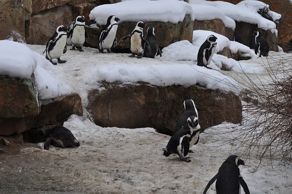 Minus 15 Grad in der Nacht: Da suchen diese Fischreiher Schutz bei den Eselspinguinen und stehen teilweise mit ihren Beinen im Wasser. Das ist nicht so kalt wie die Aussentemperaturen. Wie die Störche halten auch die Reiher nur bis zu bestimmten Minusgraden durch. Empfindlichste Stellen sind ihre Beine.