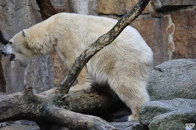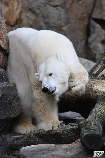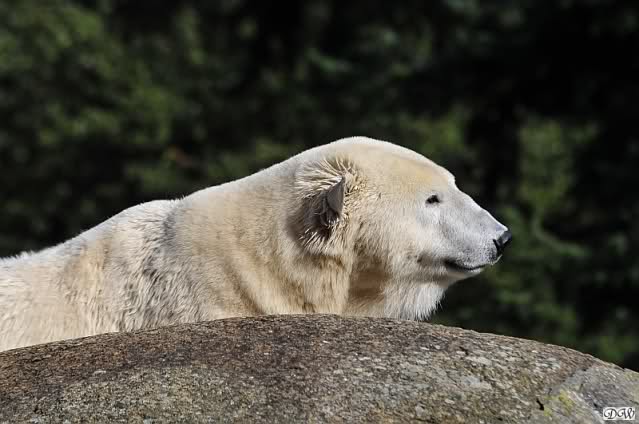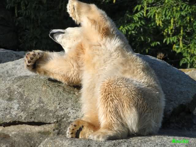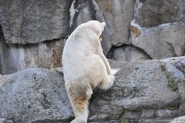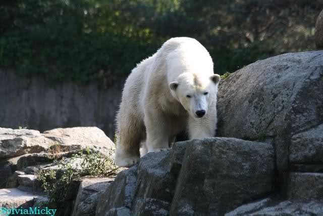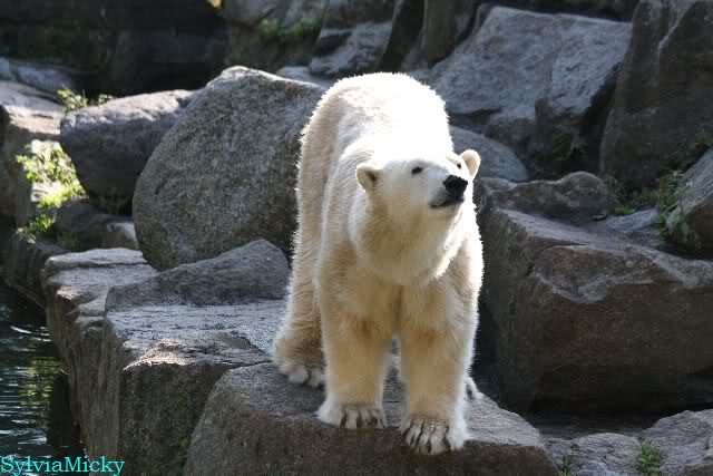 Warum Knut heute Nachmittag diese Phase hatte ? Das weiß wohl nur er allein. Jedenfalls thronte er, nachdem die drei Eisbärinnen in ihren Höhlen waren, auf dem höchsten Platz der Anlage und schaute zufrieden ins Rund.
