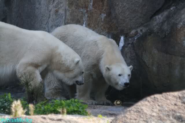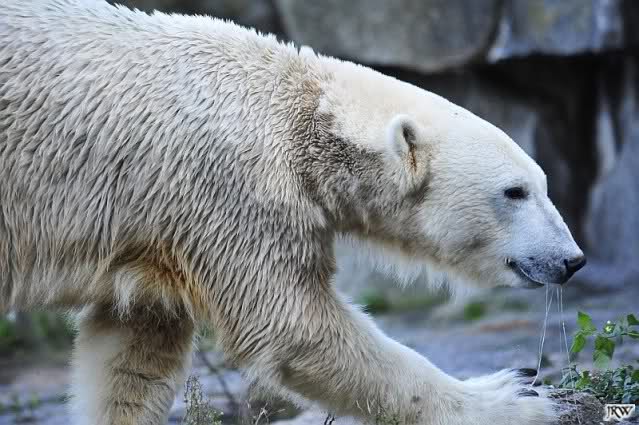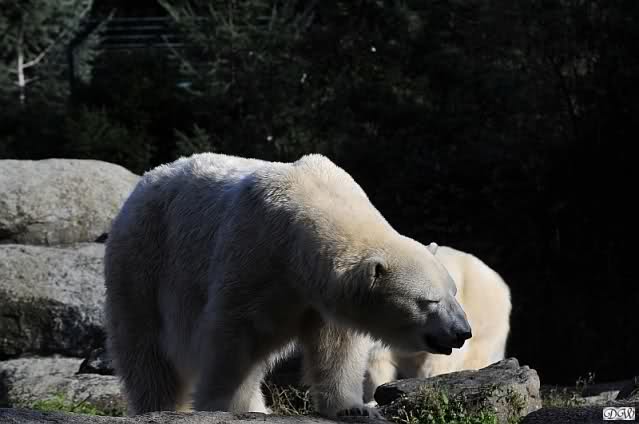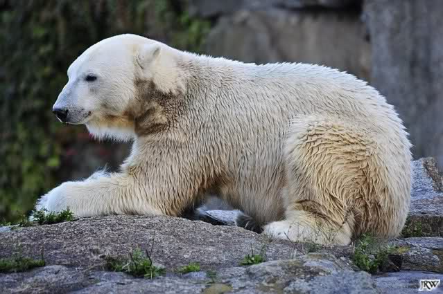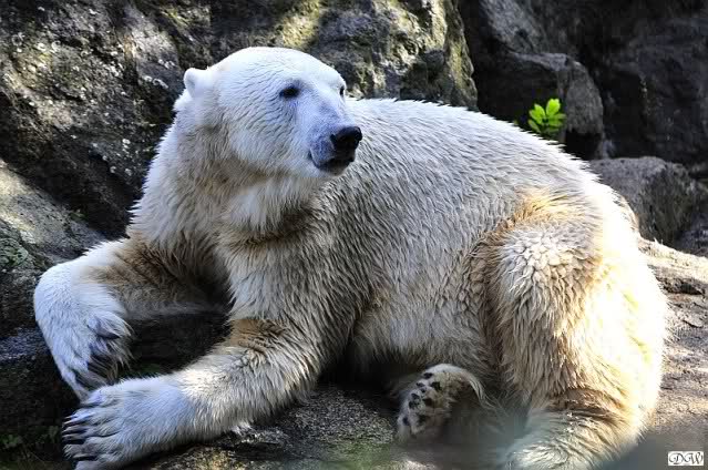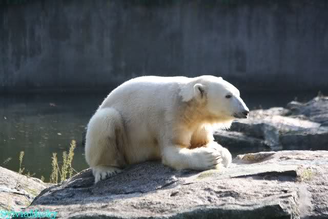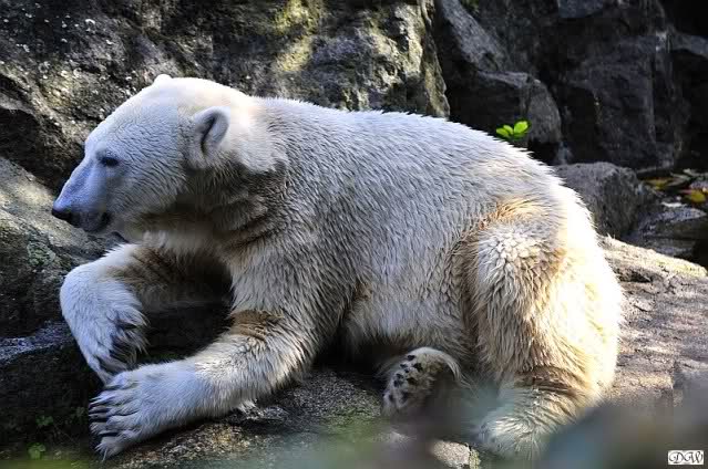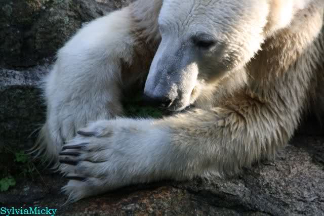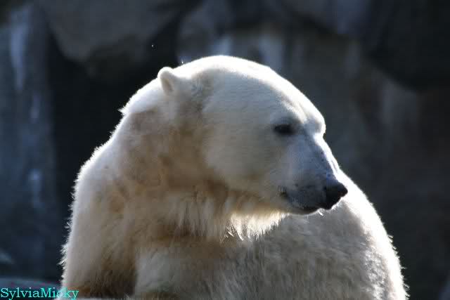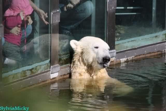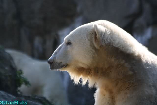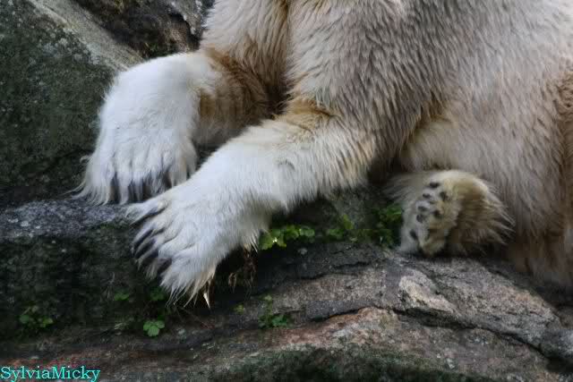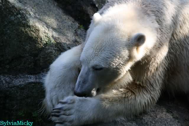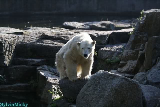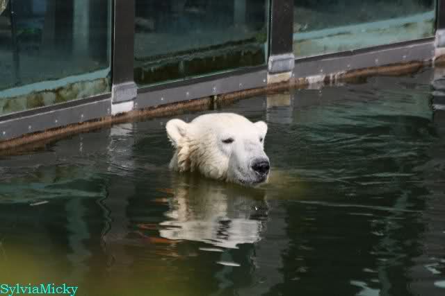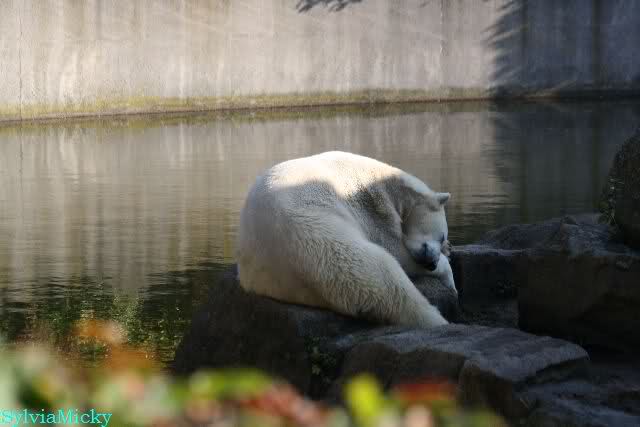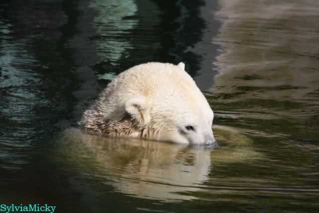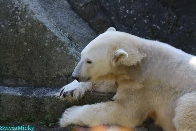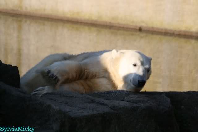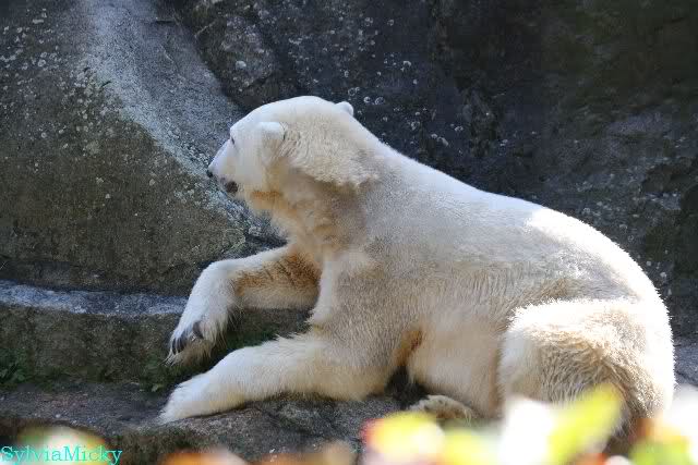 ...und in der äußersten unteren Ecke lag Knut noch als ich in den Zoo kam. Die Ohren angelegt, die Unterlippe zitterte, er machte einen nicht glücklichen Eindruck nicht nur auf die vielen auwärtigen Besucher. Besonders eine Knut Freundin aus Australien war regelrecht erschüttert. Ihr wurde gesagt das sie doch morgen nochmal vorbeischauen möge. Am Vomittag/Mittag war die Situation ja anders.