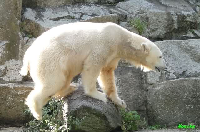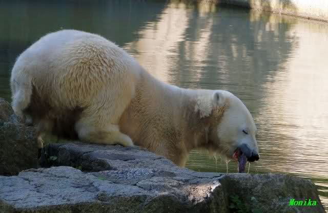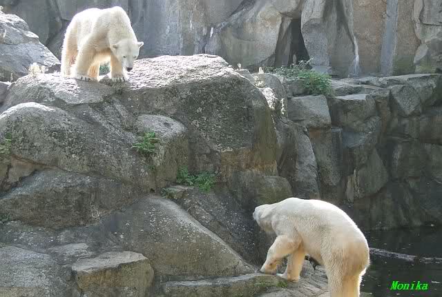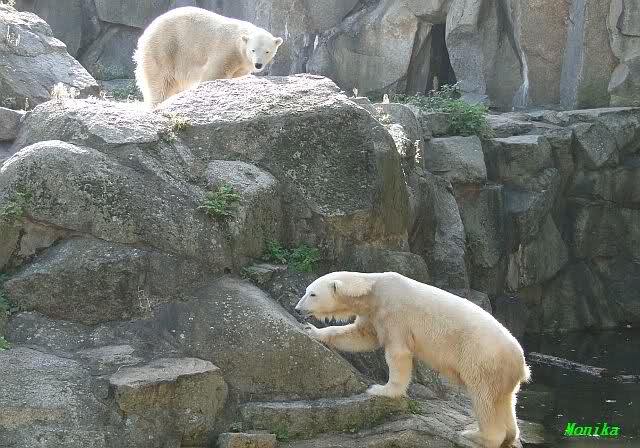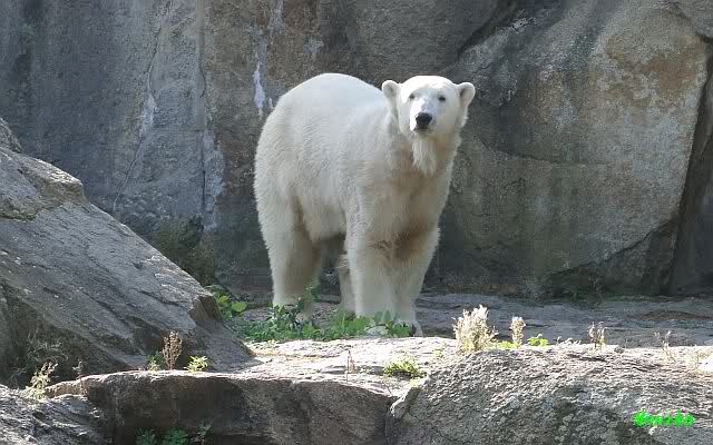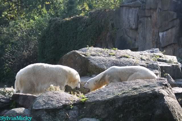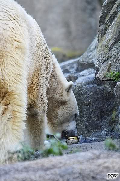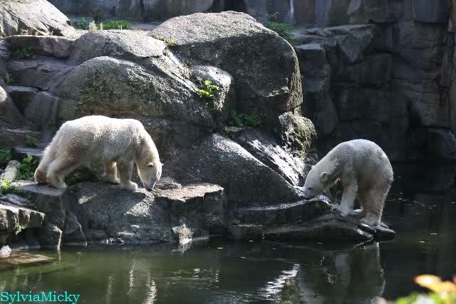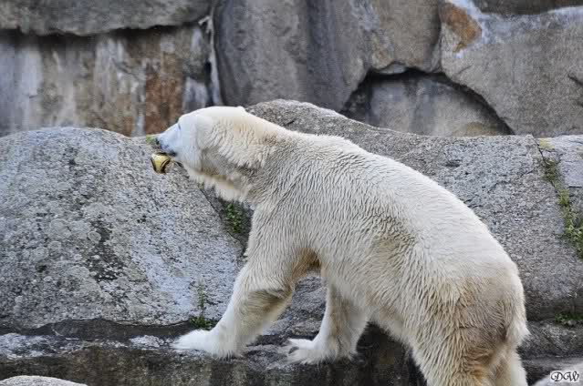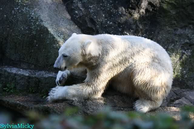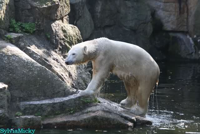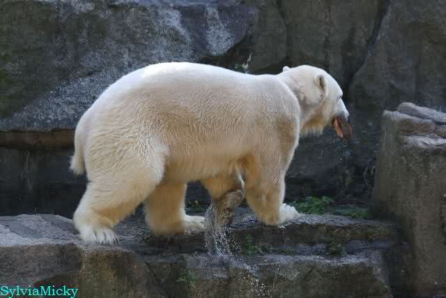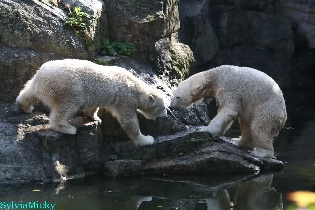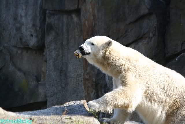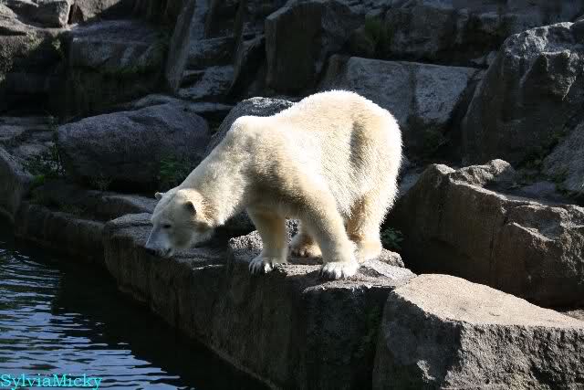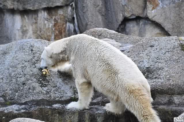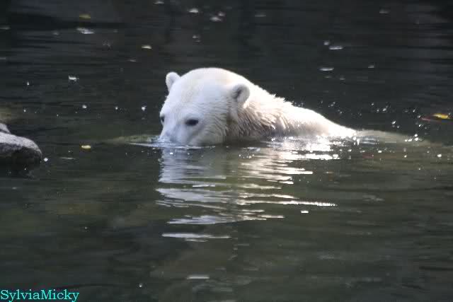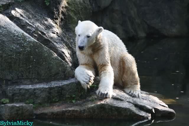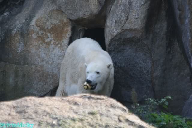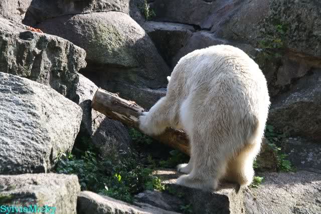 Wäre sie noch ein wenig länger geblieben, hätte sie die Verwandlung sehen können, die in Knut vorging sobald das Zicken-Trio auf der kleinen Anlage verschwunden war. Erst besuchte er Kati’s Höhle und sicherte sich sofort den höchsten Felsen. Dort sah er den lädierten Ball und holte ihn sich. Er spielte einige Zeit damit bis er ihm hinunter fiel. Auf jeden Fall sahen wir dann wieder einen relativ zufriedenen „kleinen“ Knut.