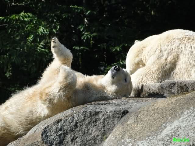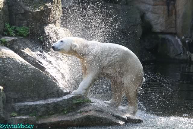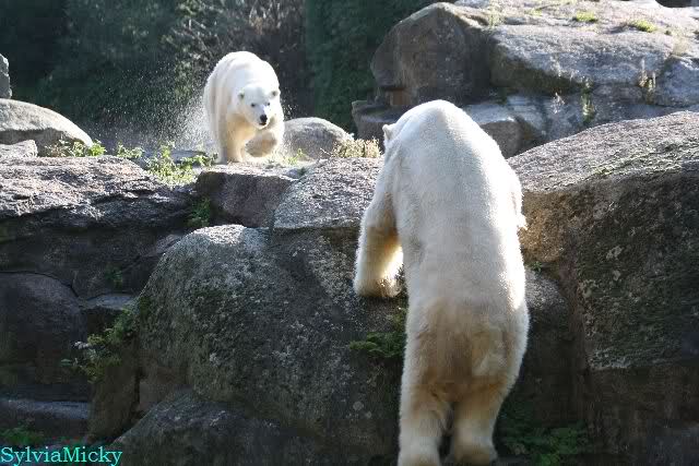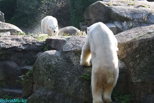 Gegen Mittag war Knut im Wasser. Die Bären auf der Anlage. Nancy ging dann zu ihm runter. Er fauchte sie aus dem Wasser aus an. Er ging dann auf die Felsen, wo dann Nancy und Tosca zu ihm gingen. Es gab dann ein kurzes Geplänkel mit Nancy. Die Bären gingen nach oben und Knut lag den ganzen Nachmittag unten rechts auf dem Felsen.