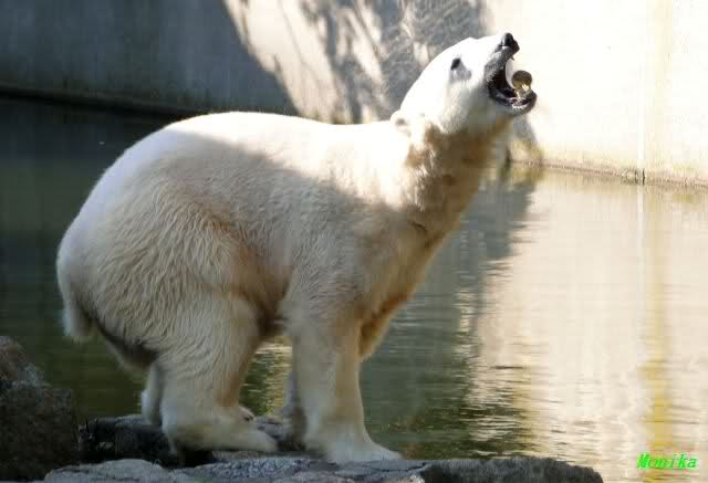Die Mahlzeit fiel für Knut heute auch nicht sehr üppig aus. Er hatte gerade mal zwei Kartoffeln und ein Stück Fleisch verspeist, als Nancy um die Ecke kam. Knut ging dann gleich wieder nach oben. Frau Weckert warf ihm zwar noch zwei Fische hinterher, aber er hat nur einen gefunden.Kurze Zeit später gab es die erste Konfrontation mit Katjuscha. Knut stand unten und Kati oben. Knut ging sogar hinauf, aber dann brüllte er was das Zeug hielt. Ich gehe mal davon aus, dass Sylvia noch Fotos davon einstellen wird. Ich habe nur gefilmt (dachte ich zumindest), und habe wohl den Knopf nicht richtig gedrückt, jedenfalls gibt es nun leider kein Video.
