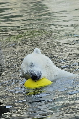 Viktoria zeigte wie schön sich mit einem Ei schmusen lässt und Lloyd präsentierte das Nackthuhn, das ihm im vergangenen Jahr von Eisbärenfreunden aus aller Welt geschenkt wurde. Lloyd entschied sich dann aber doch mit dem *tadpole*, dem anderen aussier-Spielzeug von uns ins Wasser zu gehen.