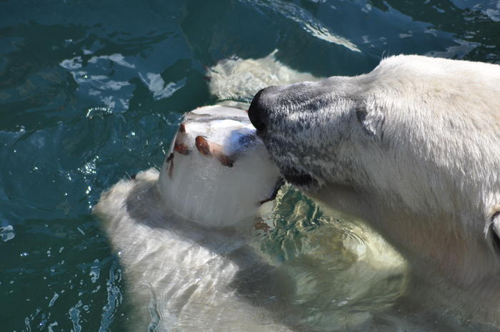 Die Pinguine stürzten sich aufgeregt auf das kühlende Geschenk und hackten mit ihren Schnäbeln auf dem Eis herum; der Eisbär hatte den Sinn der Überraschung erlickt und kühlte seinen wohl überhitzten Schädel am Eis.