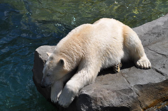 Ein Eisbär genießt die Sonne auf einem Stein im Zoo in Hannover.