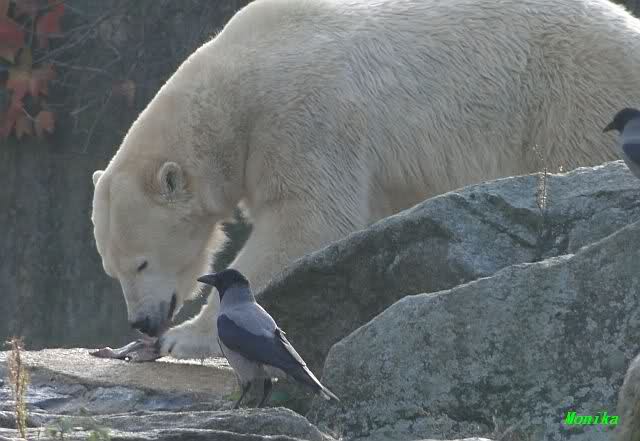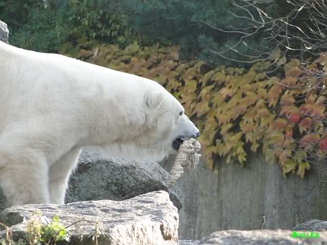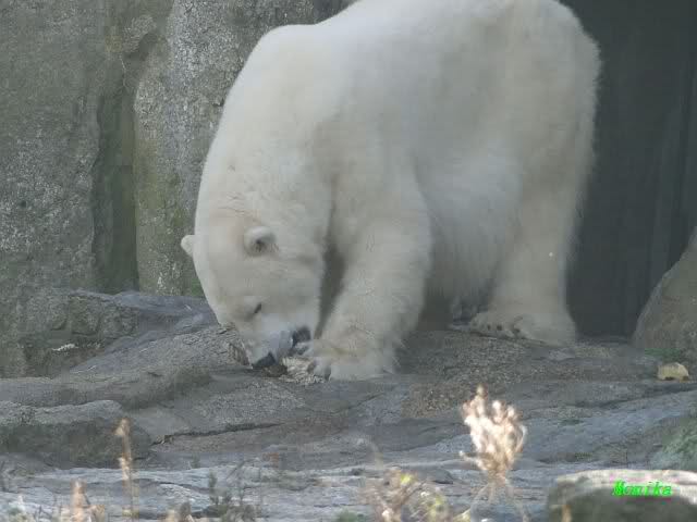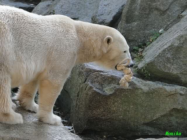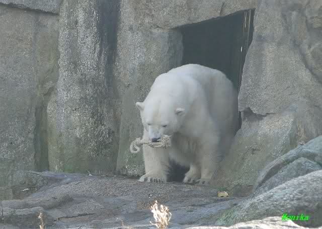 Es herrschte heute wieder Ruhe auf dem Bärenfelsen. Nach der Fütterung ging Knut auf seine rechte Ecke und es sah aus, als suchte er die Kordel. Diese hatte Tosca vorher an sich genommen und nach oben auf die Felsen gelegt. Dann kam Katjuscha und legte die Kordel vor ihrem Höhleneingang.