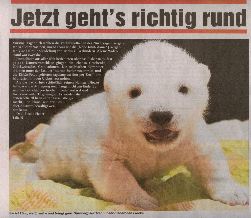 Im Laufe des heutigen Tages wurde möglicherweise durch ein Missverständnis eine Fehlmeldung über den Gesundheitszustand des Eisbärin Flocke verbreitet. Die vom Tierarzt Dr. Bernhard Neurohr bei der heutigen Pressekonferenz angesprochene Infektion des Magen-Darm- Traktes bezog sich auf den Beginn der Handaufzucht am 8. Januar 2008. Die Behandlung war vorbeugend durchgeführt worden aufgrund von geringen Schleimbeimengungen und Keimen im Kot. Das Tier hatte kein Fieber und es waren keine weiteren Krankheitserscheinungen zu diagnostizieren. Der Einsatz des Antibiotikums wurde bereits am 21. Januar 2008 abgeschlossen. Aufgrund des nach wie vor im Magen-Darm- Trakts befindlichen Heus wird vorbeugend ein Mittel gegen Hefepilze eingesetzt.