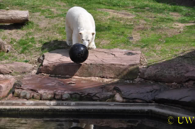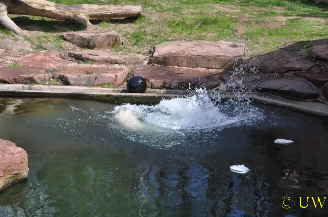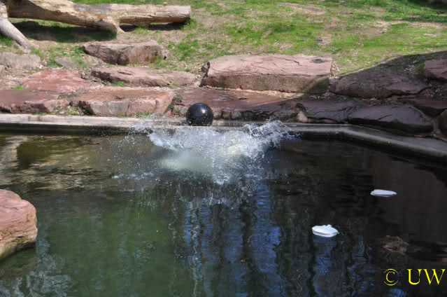 Wie man schon auf etlichen Bildern sehen konnte, befördert er seine Kugel immer irgendwie ins Wasser, springt dann nach und "fängt" sie wieder ein.
