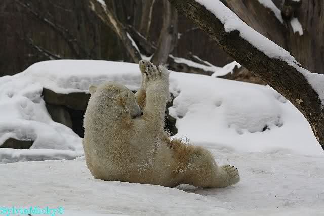 Nach dem Bad wälzte sich Knut wieder genüsslich im Schnee. Gianna schenkte ihm wenig Beachtung. Knut sah trotzdem recht zufrieden aus.