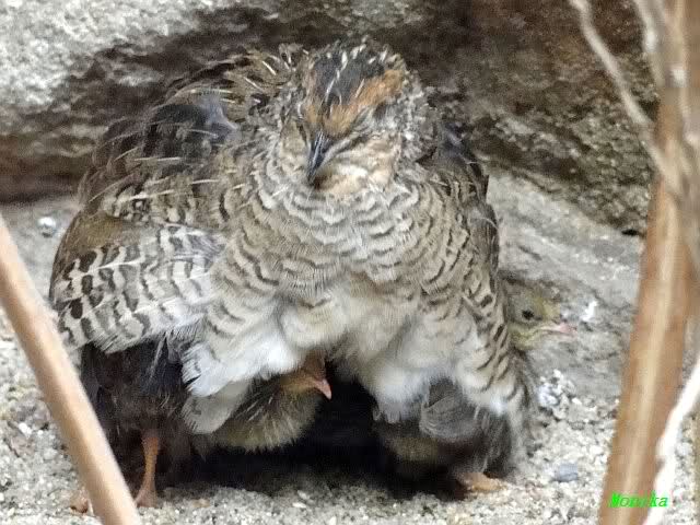 Nachwuchs bei den chinesischen Zwergwachteln. Die Kleinen verstecken sich unter Mama`s Gefieder.