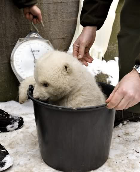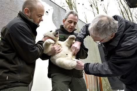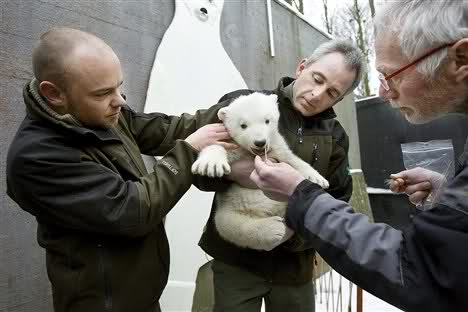 Erstmals wird der kleine Eisbär vermessen und gewogen ...