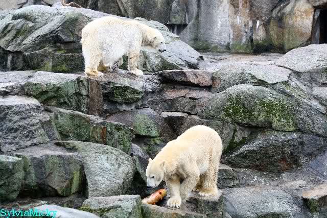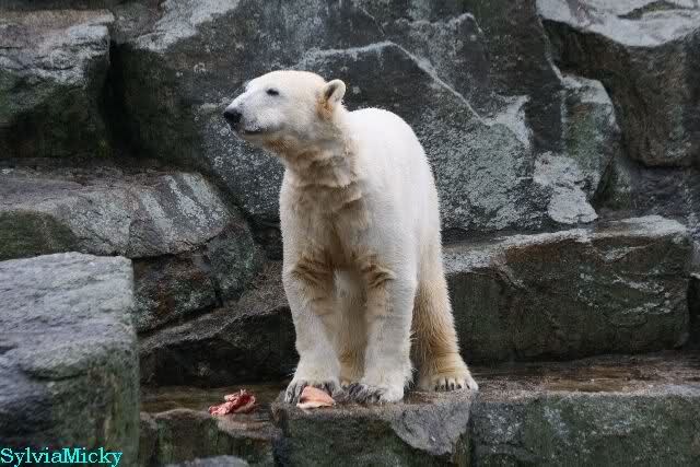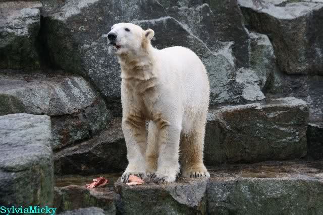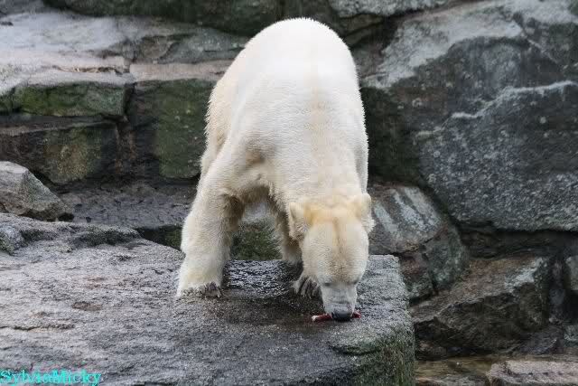 Ich hatte eigentlich gedacht, daß heute Knut drinnen ist und die Drei auf der kleinen Anlage, wegen Reinigung der Anlage. Dem war aber nicht so. Vor der Fütterung war Ruhe. Zur Fütterung gab es außer Fleisch einen schönen großen Lachs für jeden Bären. Spendiert von einer Knutfreundin aus Hamburg. Danach gab es noch Rosinenbrötchen und andere Brötchen für die Bären.