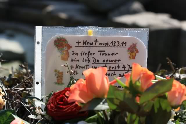 On Sunday, hundreds of people gathered at Berlin Zoo to lay down flowers and leave messages. "Thanks for all the happy memories," "Bye Knut," "We loved you so much." Many were in tears. "He was like our child. We watched him grow up," said one elderly lady, with tears running down her face.