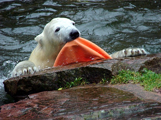Was mich heute auch sehr gefreut hat, war eine äußerst agile Vera, die mit einer roten Plastikkiste gespielt hat. Flocke hatte daran großes Interesse und hing die ganze Zeit an der Glasscheibe. Man hätte ja denken können, sie interessiert sich für Vera, aber es war eindeutig die Kiste. Das konnte man sehen, als diese dann verwaist an der Scheibe rumdümpelte und Flocke von ihrer Seite aus zu gerne drangekommen wäre. Vielleicht sollte sie ihr Spielzeug nicht immer versenken, dann müsste sie nicht nach dem der Mutter schielen Auf jeden Fall hat Vera einen guten Eindruck auf mich gemacht, sie scheint mit dem Tod ihres Nachwuchses gut zurecht zu kommen. Es ist halt doch was völlig anderes, wenn sie sehen kann, was passiert und ihr nicht einfach von einer Minute auf die andere das Kind genommen wird, so wie es bei Flocke war.